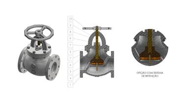 Vedação em bronze e gaxeta em teflon, reduzindo vazamentos e aumentando a segurança do sistema.