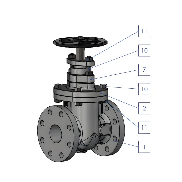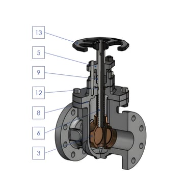 Corpo e castelo em ferro cinzento ASTM A126 Gr.B, garantindo durabilidade.