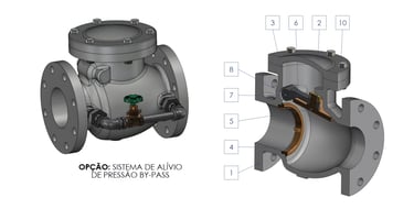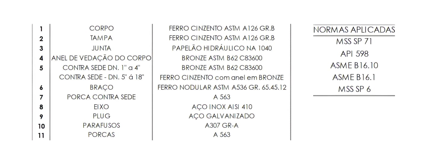 Materiais resistentes como ferro fundido ASTM A126 GR.B, bronze ASTM B62 e eixo em inox AISI 410, garantindo maior integridade mesmo sob variações de pressão.