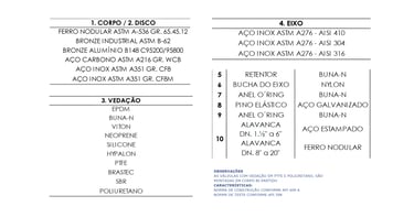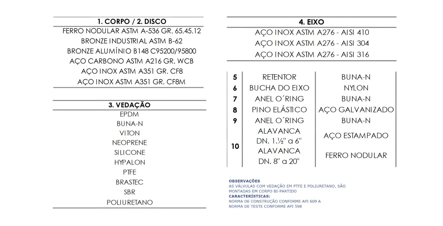 Vedação em elastômeros (EPDM, BUNA-N, Viton, etc.), assegurando fechamento eficiente com baixa perda de carga.