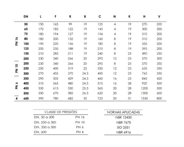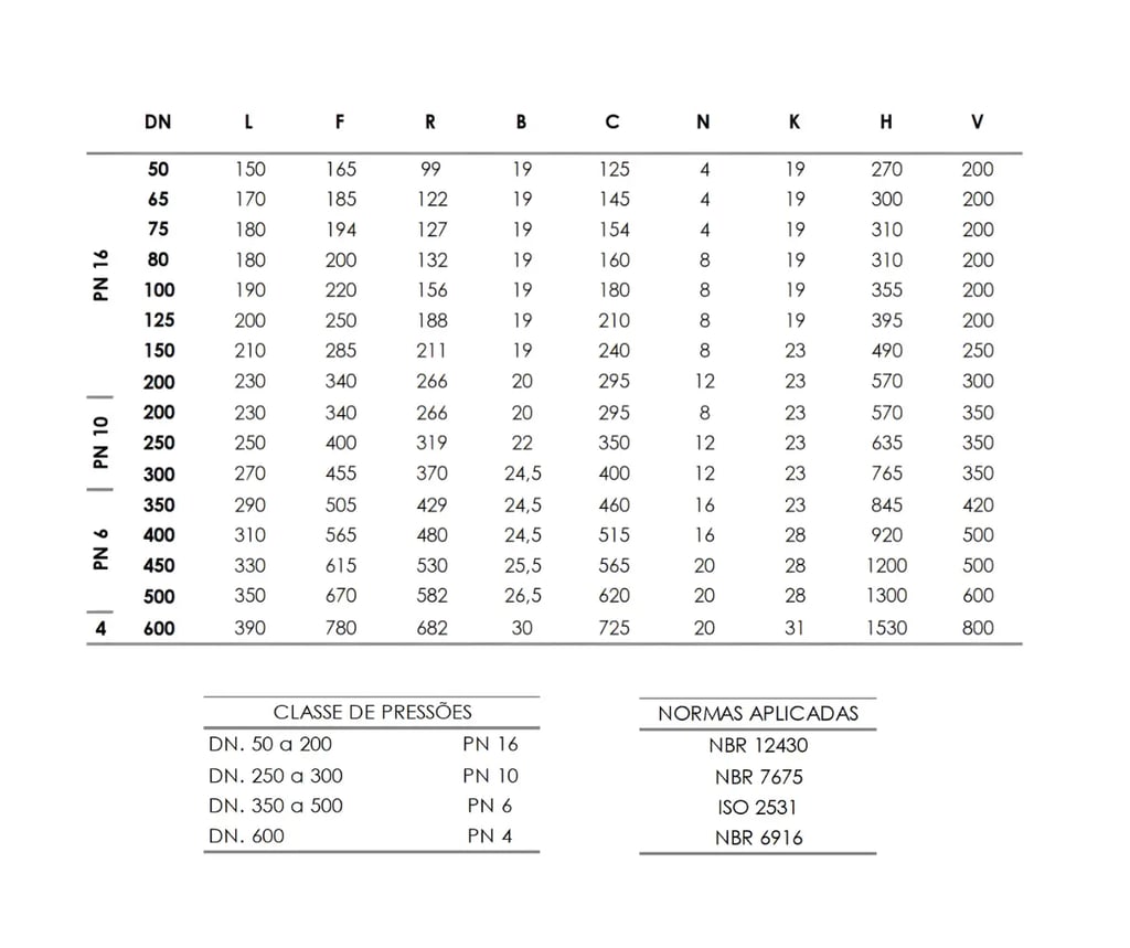 Vedação com anéis e componentes em aço inox, oferecendo desempenho estável em diferentes faixas de pressão (PN4 a PN16).