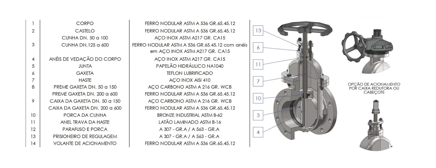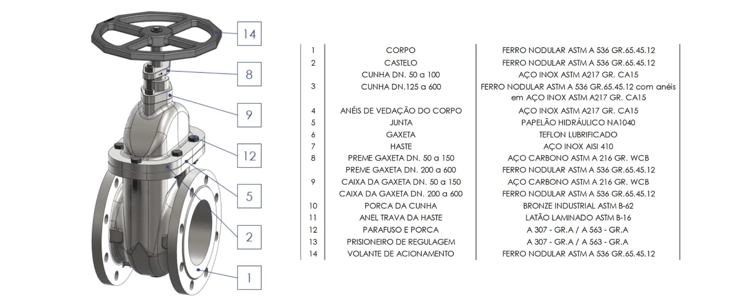 Corpo em ferro nodular e cunha em aço inox CA15, garantindo alta resistência e menor risco de falhas.