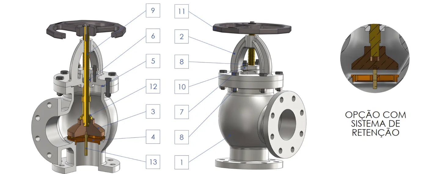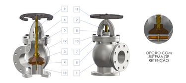 Contra-sede e anel de vedação em bronze ASTM B62, assegurando vedação confiável e reduzindo riscos de vazamento.