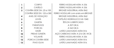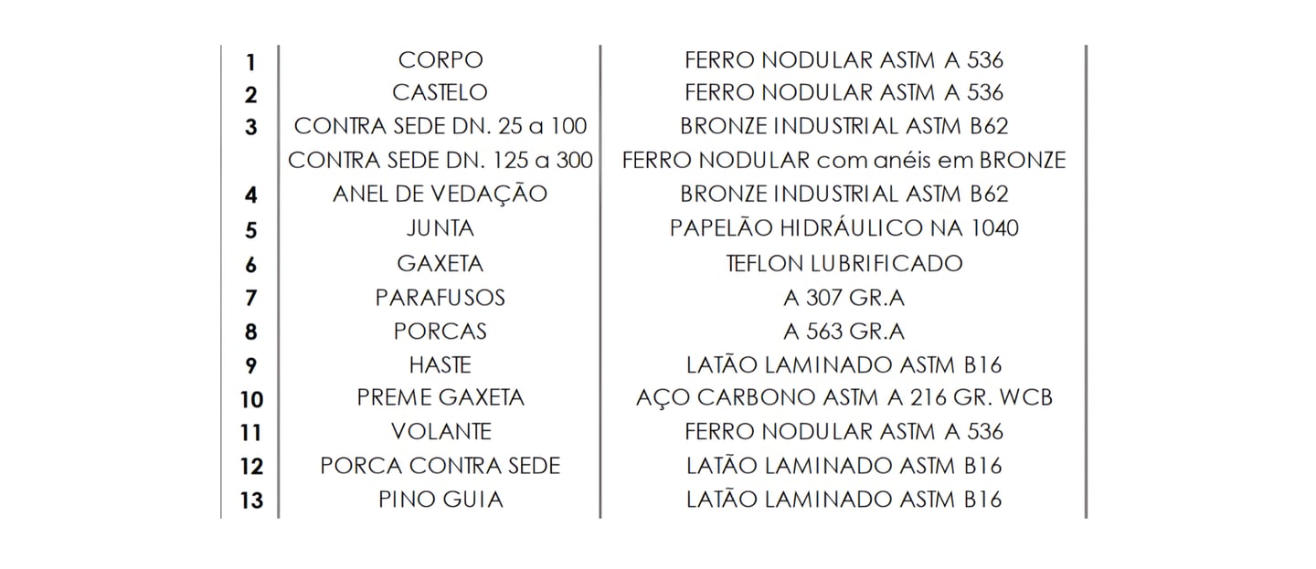 Corpo e castelo em ferro nodular ASTM A536, garantindo resistência estrutural e operação segura.